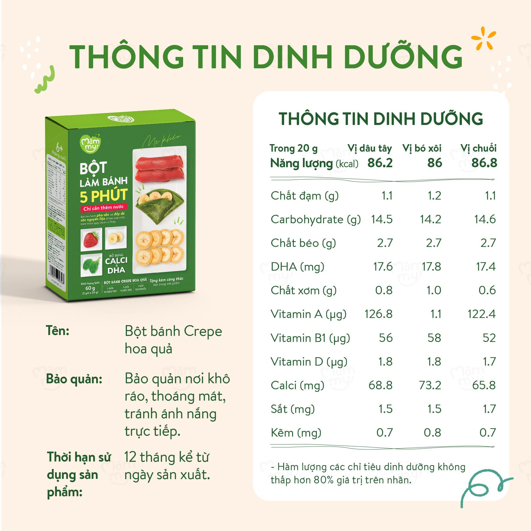 Giai đoạn ăn dặm là thời điểm vàng để bé khám phá những hương vị mới và bổ sung dưỡng chất cho sự phát triển toàn diện. Với Bột làm bánh Crepe hoa quả Mămmy, mẹ có thể dễ dàng đổi vị bữa phụ cho con bằng những chiếc bánh thơm ngon với 3 hương vị tự nhiên: Bó xôi, Chuối và Dâu tây. Chỉ trong 5 phút chế biến cực kỳ đơn giản, sản phẩm giúp cung cấp năng lượng và các dưỡng chất thiết yếu, mang lại niềm vui ăn uống cho bé từ 6 tháng tuổi.