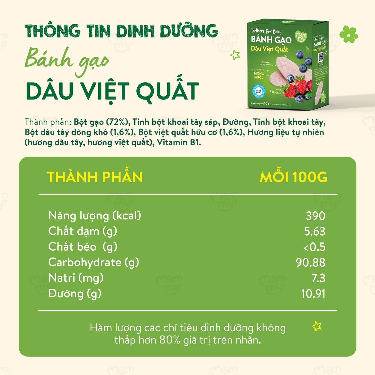 Giai đoạn ăn dặm là thời điểm vàng để bé làm quen với thực phẩm, hình thành thói quen ăn uống lành mạnh và phát triển toàn diện. Với Bánh gạo Dâu Việt Quất – 50 g, sản phẩm được chế biến từ 100% nông sản Việt tươi ngon, giúp bé làm quen với rau củ từ sớm, hỗ trợ tiêu hóa và tự tin khám phá thế giới ẩm thực ngay trong những năm đầu đời.