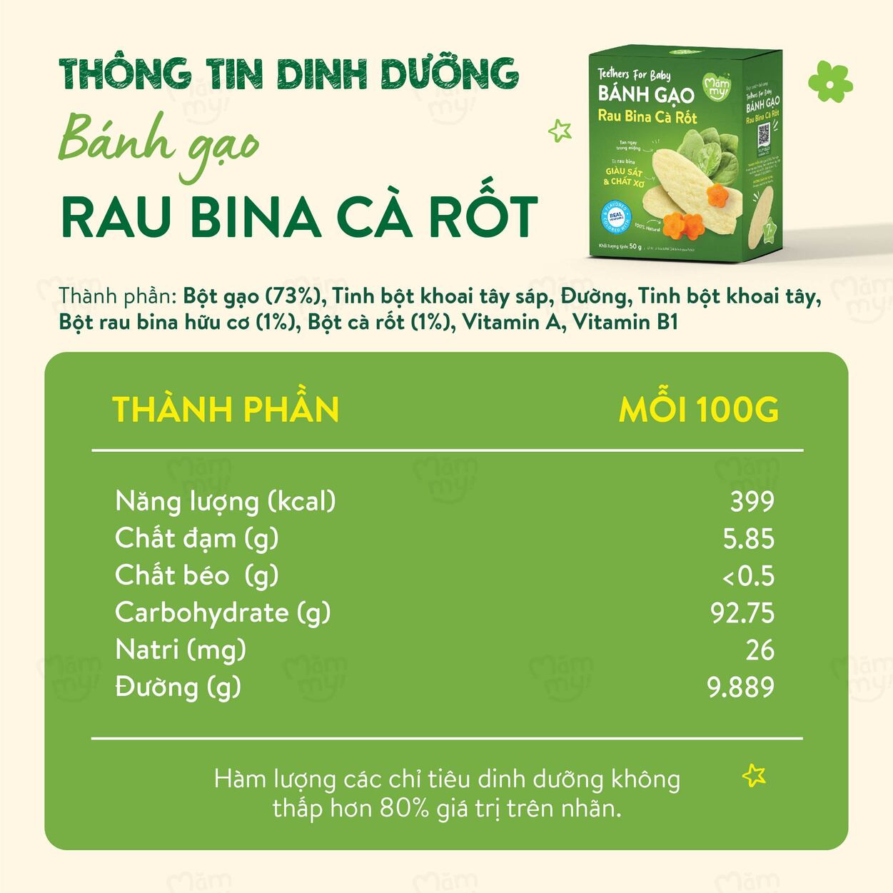 Bột gạo (73%), Tinh bột khoai tây sáp, Đường, Tinh bột khoai tây, Bột rau bina hũu cơ (1%), Bột cà rốt (1%), Vitamin B1 (0.0008%)