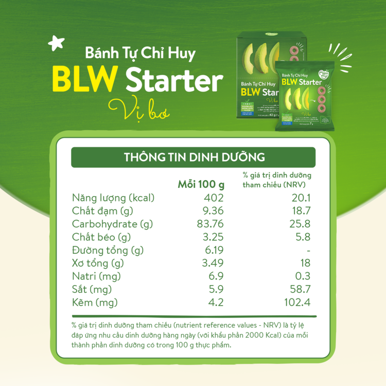 Giai đoạn ăn dặm là thời điểm vàng để bé tập ăn chủ động, rèn luyện kỹ năng nhai nuốt và xây dựng nền tảng dinh dưỡng vững chắc. Với Bánh Tự Chỉ Huy – BLW Starter vị Bơ 42g (7g x 6 gói), sản phẩm được nghiên cứu dành riêng cho bé từ 6 tháng tuổi, giúp bé tự ăn an toàn nhờ kết cấu xốp giòn, tan nhanh trong miệng, đồng thời bổ sung các vi chất quan trọng như Sắt, Kẽm, chất xơ hòa tan và đạm thực vật, hỗ trợ hệ tiêu hóa và sự phát triển toàn diện trong giai đoạn ăn dặm đầu đời.