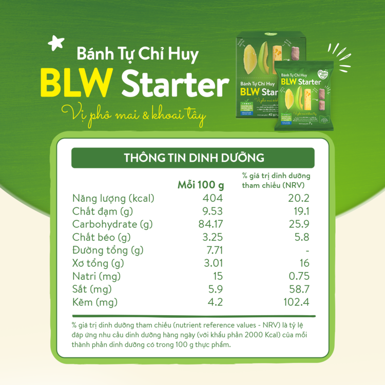 Giai đoạn ăn dặm là thời điểm vàng để bé tập ăn chủ động, rèn luyện kỹ năng nhai nuốt và xây dựng nền tảng dinh dưỡng vững chắc. Với Bánh Tự Chỉ Huy – BLW Starter vị Phô Mai Khoai Tây 42g (7g x 6 gói), sản phẩm được nghiên cứu dành riêng cho bé từ 6 tháng tuổi, giúp bé tự ăn an toàn nhờ kết cấu xốp giòn, tan nhanh trong miệng, đồng thời bổ sung các vi chất quan trọng như Sắt, Kẽm, chất xơ hòa tan và đạm thực vật, hỗ trợ hệ tiêu hóa và sự phát triển toàn diện trong giai đoạn ăn dặm đầu đời.