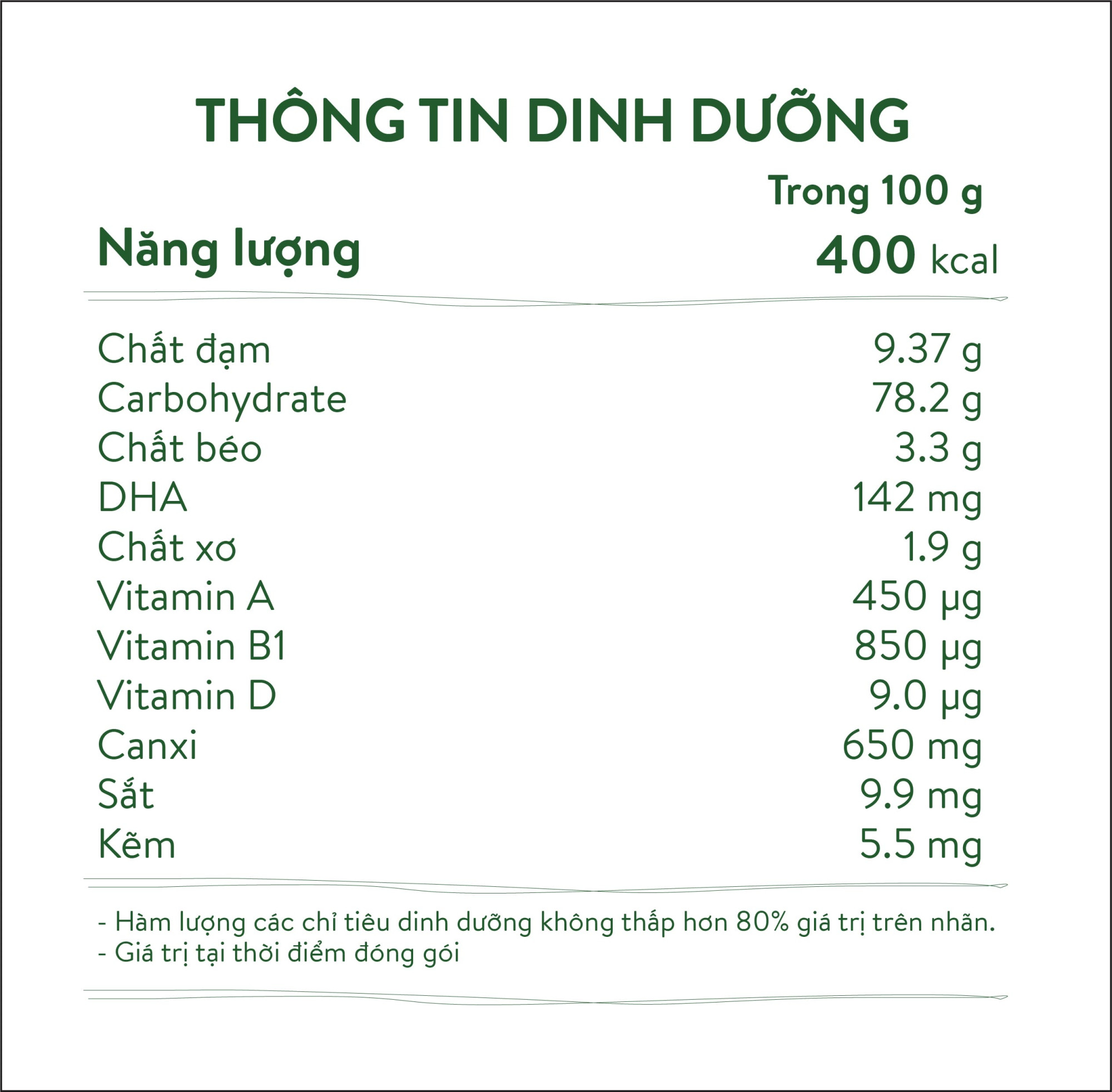 - BỘT ĂN DẶM TRÁI CÂY MÙA HÈ (SỮA CHUỐI ĐÀO): Bột gạo (40%), bột sữa (30%), bột trái cây (chuối,đào) (6%), maltodextrin, chất xơ hòa tan, hỗn hợp các vitamin và khoáng (vitamin A (Retinyl acetate)), vitamin B1 (Thiamin mononitrate), vitamin D (Cholecalciferol), calci (Calcium hydrogen phosphate), DHA. - BỘT ĂN DẶM SỮA BẮP NON: Bột gạo (40%), bột sữa (30%), bột bắp non (10%), maltodextrin, chất xơ hòa tan inulin, hỗn hợp các vitamin và khoáng (vitamin A (Retinyl acetate)), vitamin B1 (Thiamin mononitrate), vitamin D (Cholecalciferol), calci (Calcium hydrogen phosphate), DHA. - BỘT ĂN DẶM GẠO SỮA YẾN MẠCH: Bột yến mạch (40%), sữa bột béo (20%), bột gạo (15%), maltodextrin, hỗn hợp các vitamin và khoáng (vitamin A (Retinyl acetate)), vitamin B1 (Thiamin mononitrate), vitamin D (Cholecalciferol), calci (Calcium hydrogen phosphate), DHA, lợi khuẩn (Bifidobacterium Lactics)