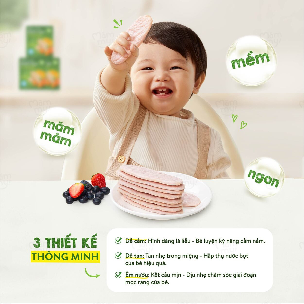 Bánh gạo rau củ Mămmy được làm từ gạo và rau củ tươi, sau đó sấy giòn ở nhiệt độ thấp. Không chiên, không chất bảo quản. Quy trình khép kín, kiểm tra nghiêm ngặt, đảm bảo bánh giòn tan, an toàn cho bé từ 7 tháng.