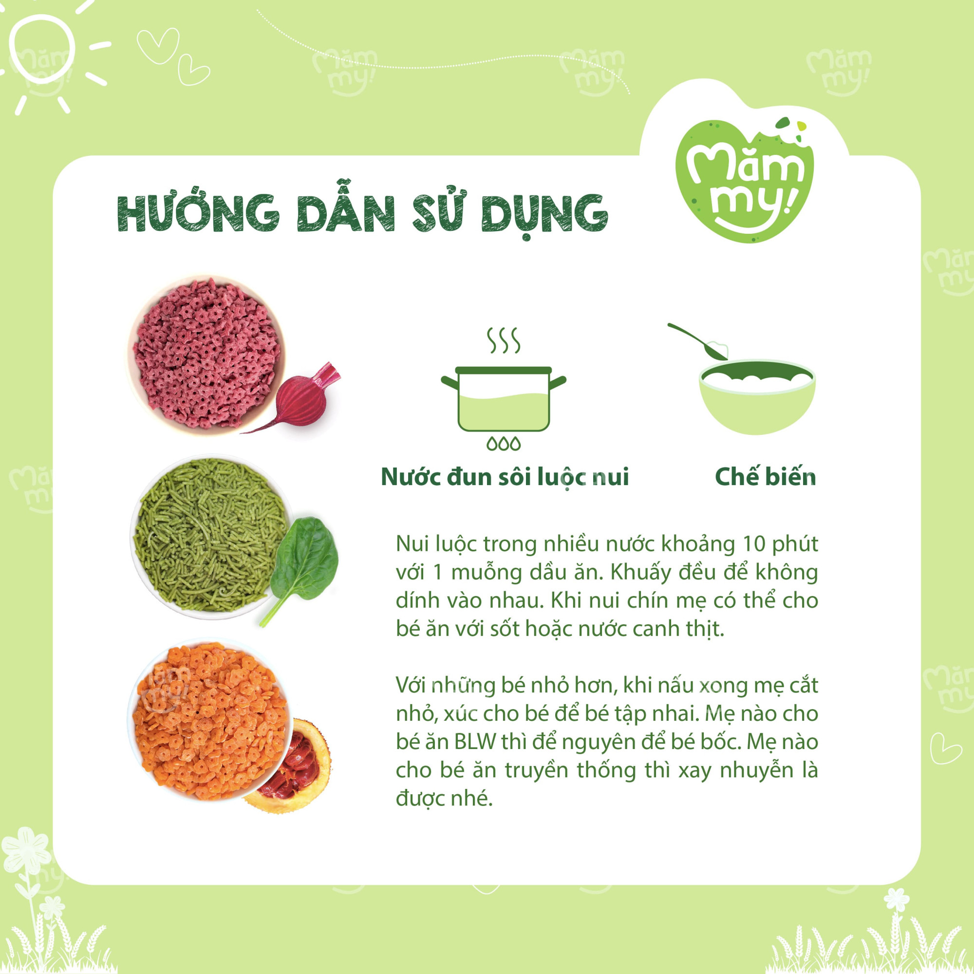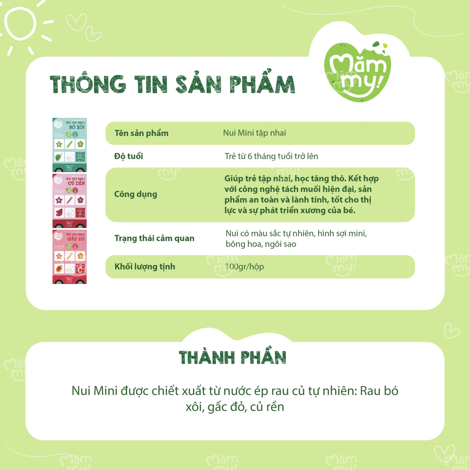 Giai đoạn ăn dặm là thời điểm vàng để bé tập nhai, khám phá hương vị và làm quen với các loại thực phẩm giàu chất xơ. Với Nui Rau Củ Mini Mămmy, mẹ hoàn toàn yên tâm bổ sung vào thực đơn của con nguồn dinh dưỡng xanh mát từ tự nhiên. Sản phẩm được chiết xuất từ nước ép rau củ hữu cơ, không chỉ mang lại màu sắc bắt mắt kích thích thị giác mà còn hỗ trợ hệ tiêu hóa và cung cấp vitamin thiết yếu cho bé phát triển toàn diện ngay từ 6 tháng tuổi.