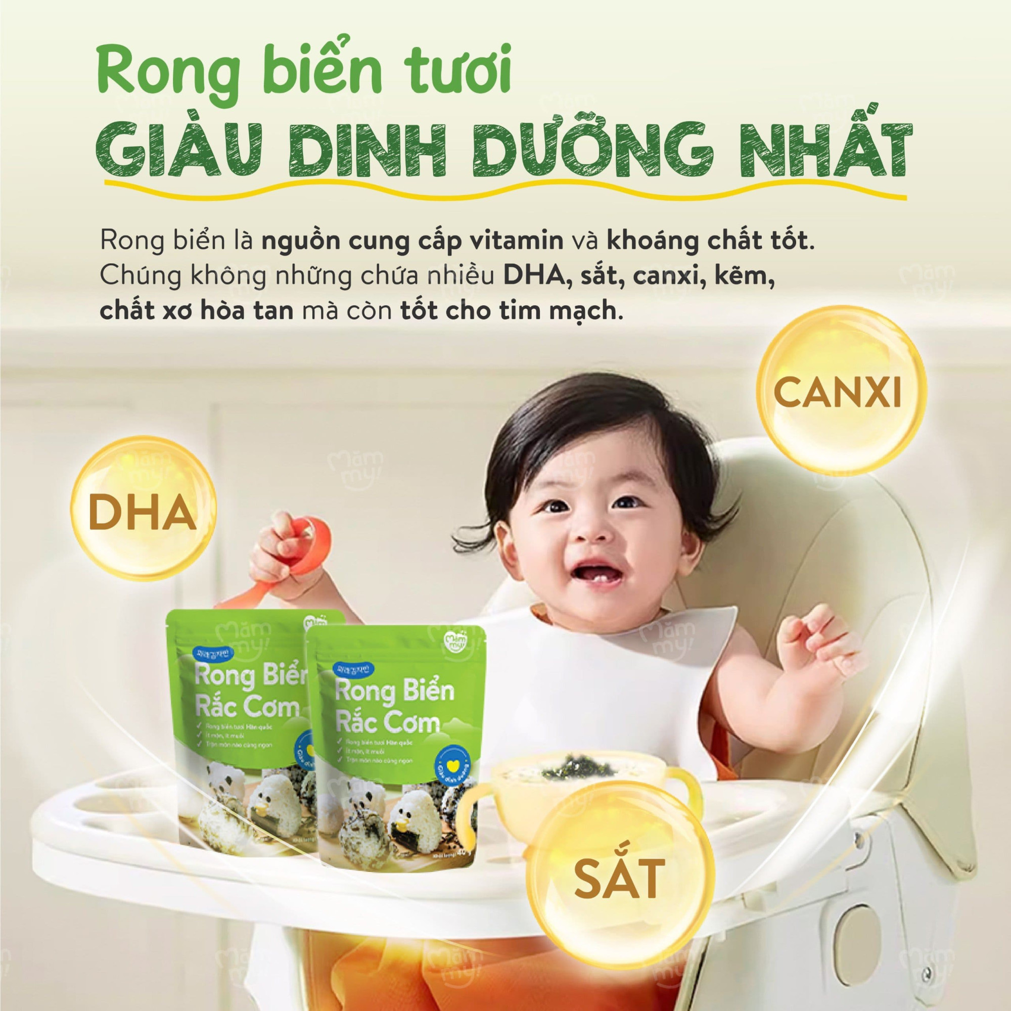 Hỗ trợ bé ăn ngon miệng: Rong biển xanh giòn kết hợp mè rang thơm lừng tạo hương vị hấp dẫn, giúp bé hứng thú hơn trong bữa ăn.