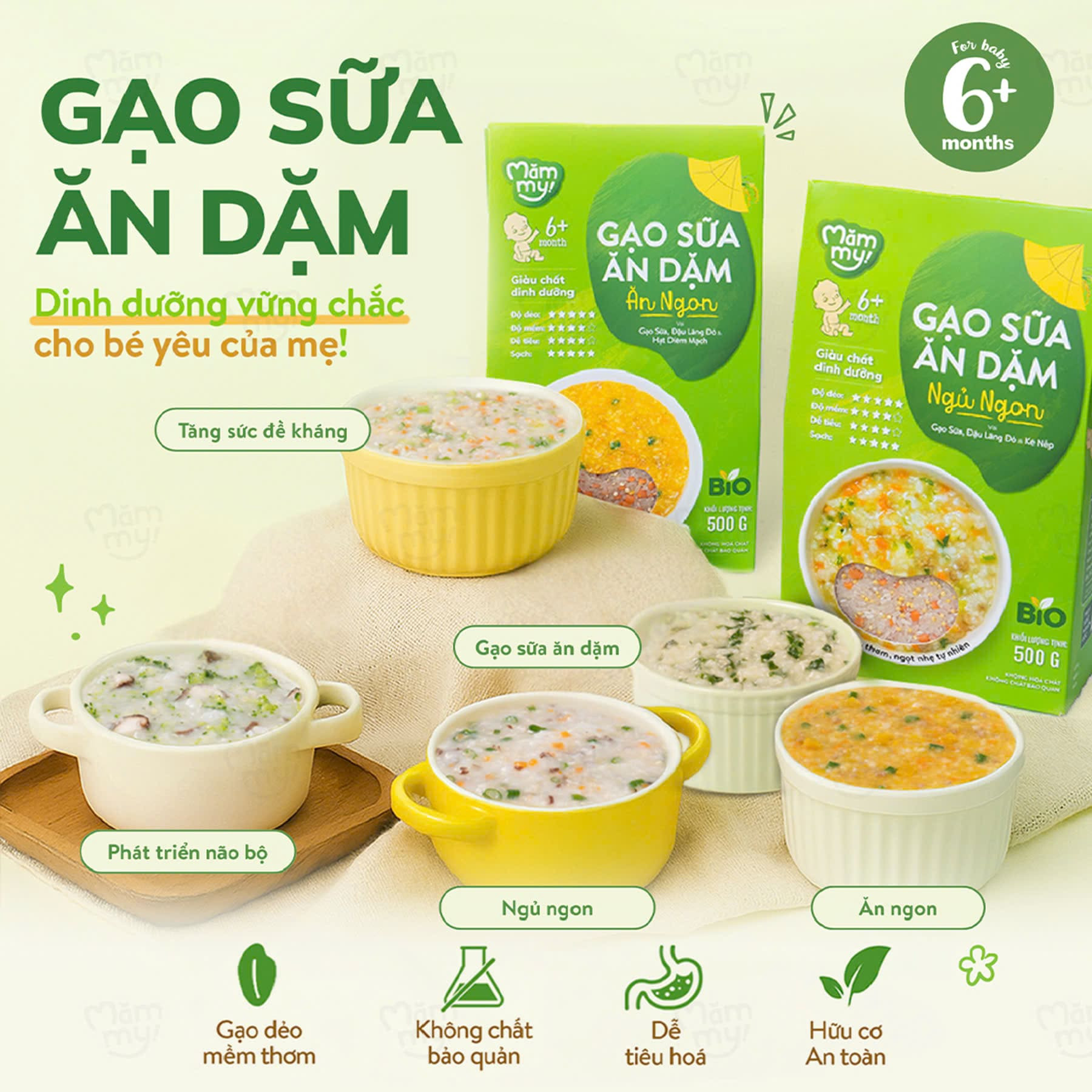 Giai đoạn ăn dặm là thời điểm vàng để bé tập ăn ngon, hấp thu tốt và phát triển khỏe mạnh. Với Gạo sữa ăn dặm – Hộp 500 g - được nghiên cứu dành riêng cho bé từ 6 tháng tuổi, hạt gạo sữa được chọn lọc kỹ lưỡng, không hóa chất, không chất bảo quản, gạo sữa Mămmy cho cháo dẻo thơm tự nhiên, không khô cứng như gạo thường, giúp bé ăn ngon miệng hơn và hỗ trợ quá trình ăn dặm an toàn, hiệu quả ngay từ những năm đầu đời.