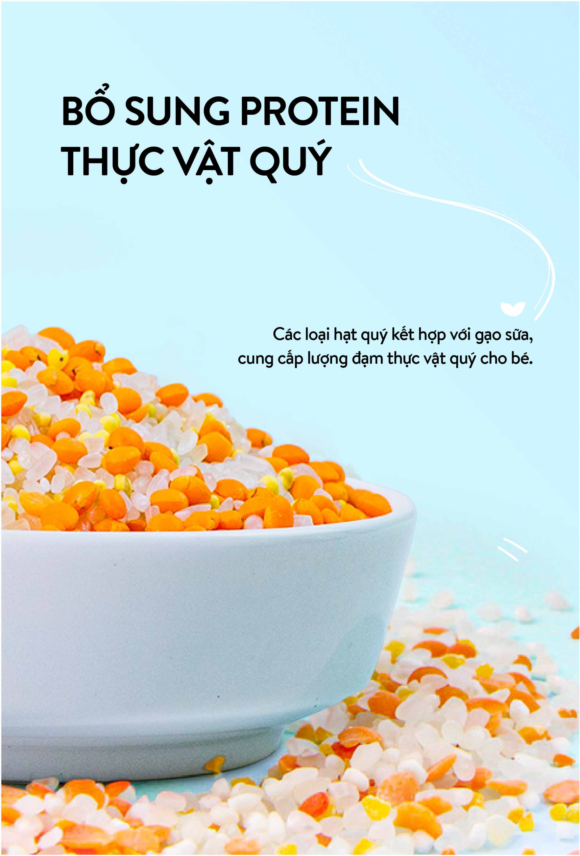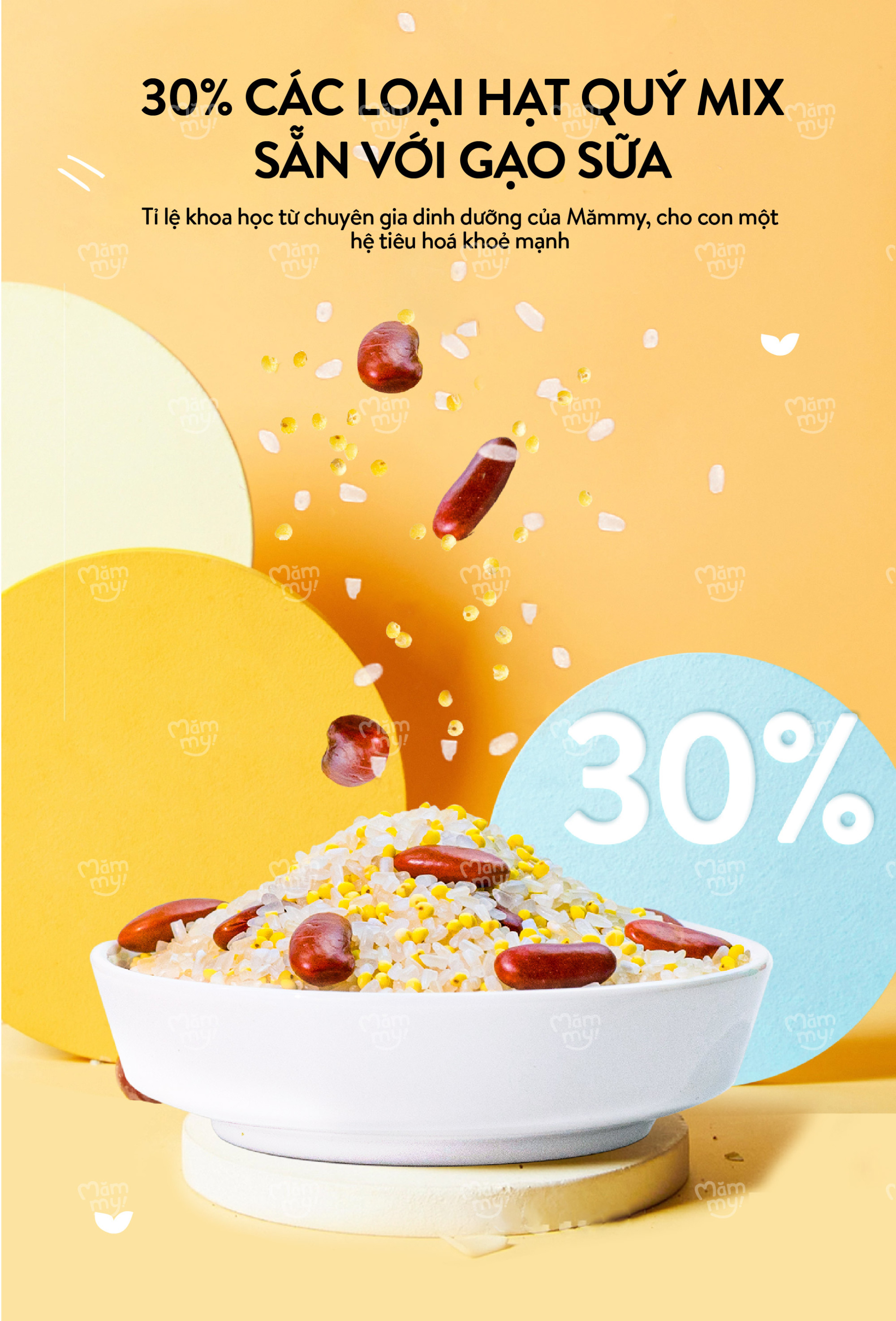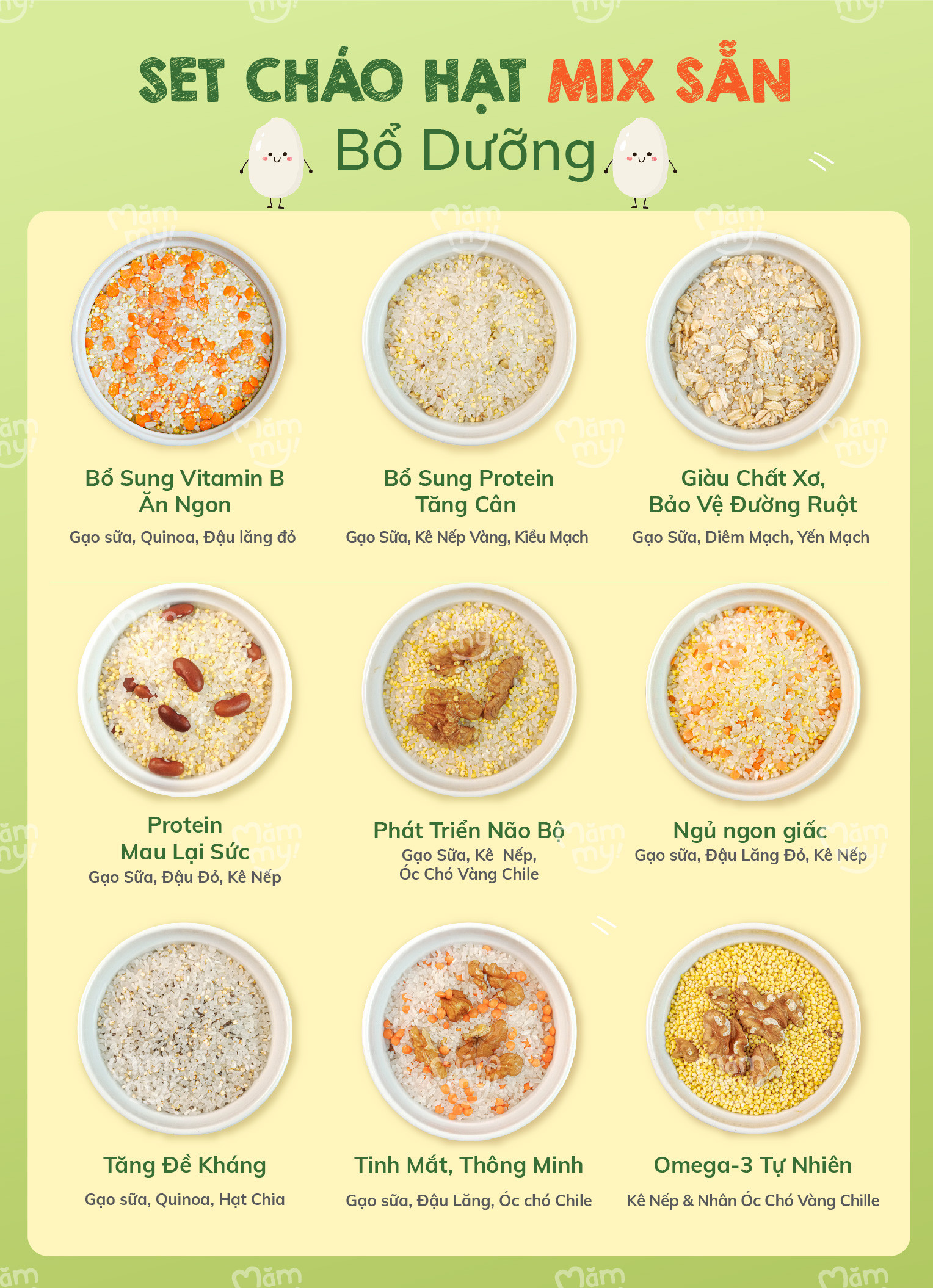 1. Ăn ngon: 70% Gạo sữa, 7% Quinoa, 23% Đậu lăng đỏ 2. Immune Booster: 74% Gạo sữa, 9% Quinoa, 17% Yến mạch 3. Giàu protein: 62% Gạo sữa, 17% Đậu đỏ, 21% Kê nếp 4. Ngủ ngon: 70% Gạo sữa, 15% Đậu lăng đỏ, 15% Kê nếp 5. Omega 3 tự nhiên: 88% Kê nếp, 12% Nhân óc chó vàng Chile 6. Brain booster: 67% Gạo sữa, 26% Kê nếp, 7% Óc chó vàng Chile 7. Tăng cân: 74% Gạo sữa, 22% Kê nếp vàng, 4% Kiều mạch 8. Tăng đề kháng: 72% Gạo sữa, 25% Quinoa, 3% Hạt chia 9. Tinh mắt: 70% Gạo sữa, 22% Đậu lăng đỏ, 8% Óc chó Chile