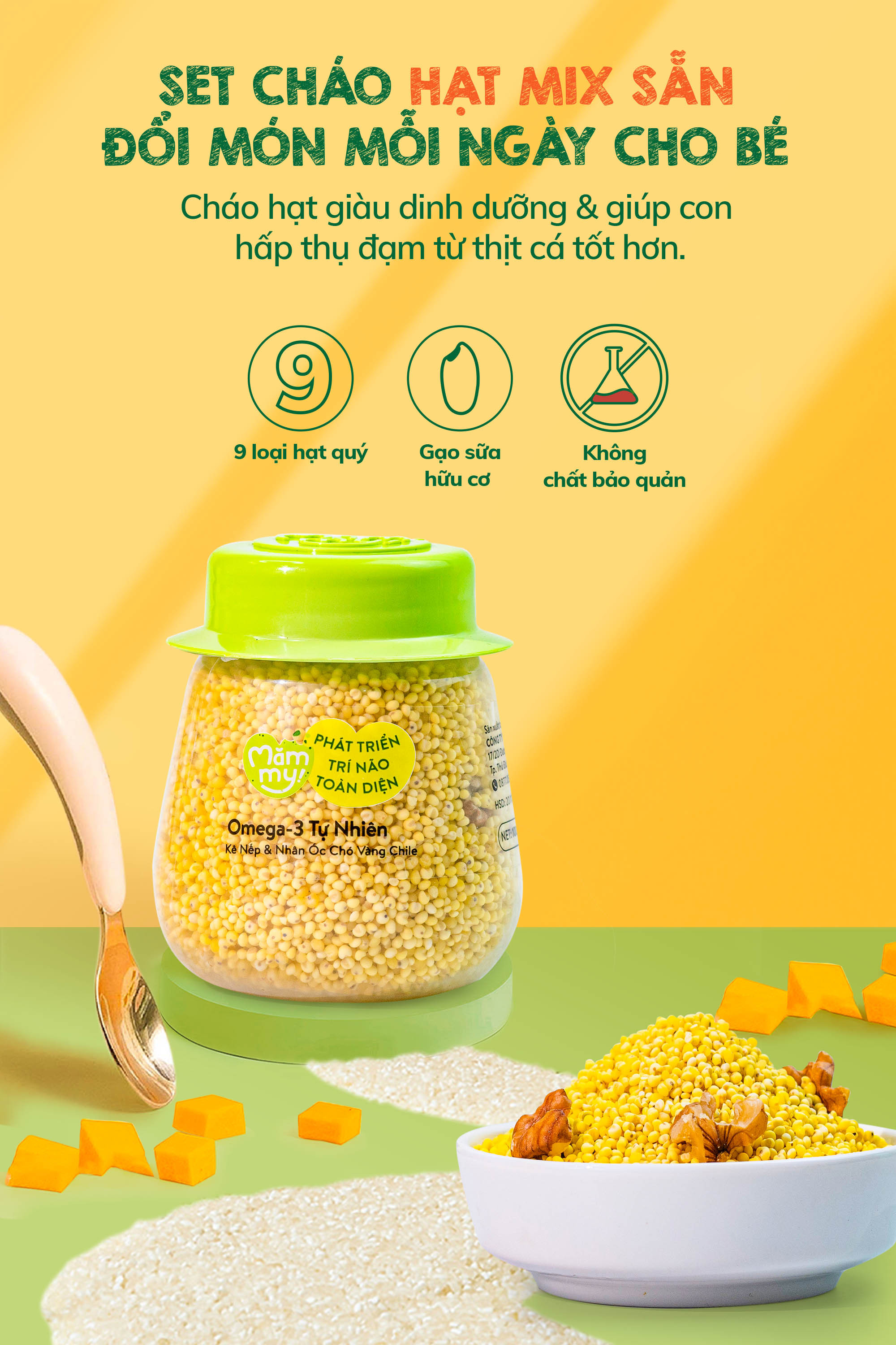 Giai đoạn 6 tháng tuổi là cột mốc quan trọng khi bé bắt đầu hành trình khám phá thực phẩm thô. Để giúp mẹ không còn đau đầu với câu hỏi "Hôm nay cho bé ăn gì?", Combo 9 hũ hạt Mix Mămmy mang đến giải pháp ăn dặm đa dạng, tiện lợi và giàu đạm thực vật. Với công thức phối trộn tỷ lệ vàng giữa các loại hạt quý, bộ sản phẩm không chỉ giúp cháo sánh mịn, thơm ngon mà còn bổ sung nguồn Omega-3, chất xơ và khoáng chất tự nhiên giúp bé thông minh, cao lớn.