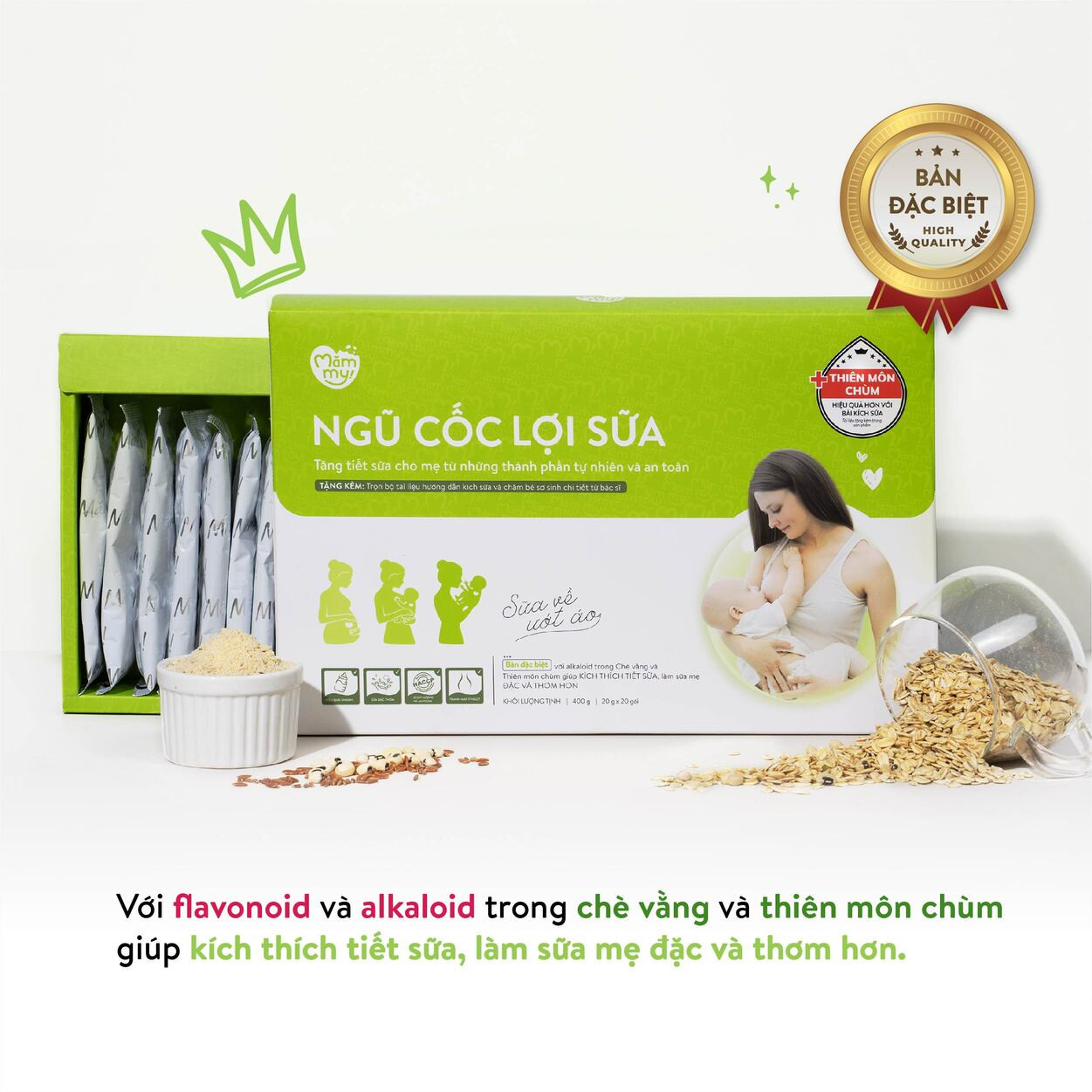Tỷ lệ chuẩn lợi sữa: Sự kết hợp hoàn hảo giữa các loại hạt ngũ cốc và thảo dược quý theo công thức nghiên cứu chuyên sâu.