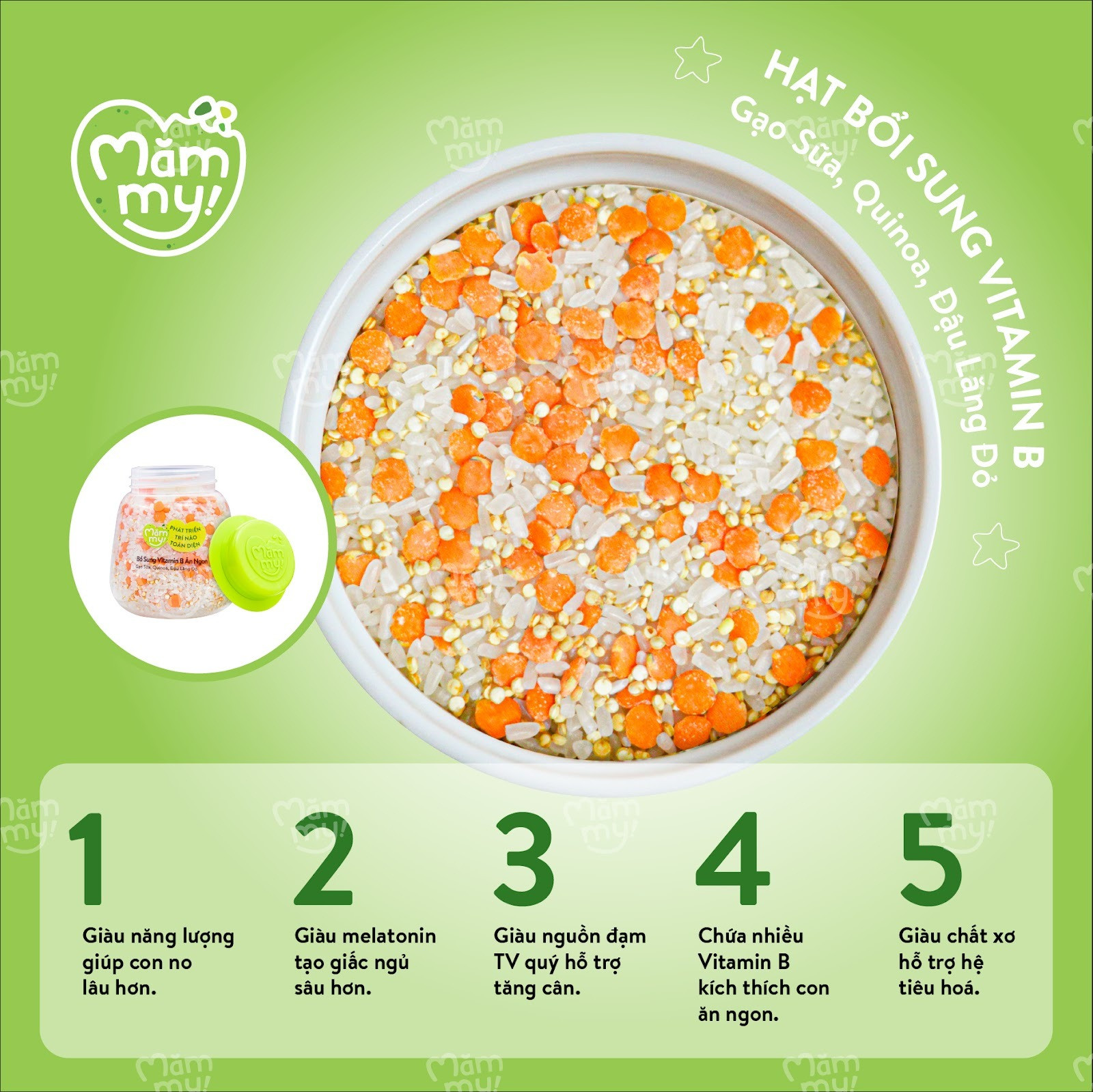 Giai đoạn 6 tháng tuổi, bé bắt đầu hành trình khám phá hương vị và cần nguồn dinh dưỡng đa dạng để phát triển. Hạt mix nấu cháo bổ sung vitamin B giúp bé ăn ngon (Gạo sữa, Diêm mạch Quinoa, Đậu lăng đỏ) là công thức "vàng" được nghiên cứu chuyên biệt để hỗ trợ hệ tiêu hóa và kích thích vị giác, giúp bé ăn ngon miệng và hấp thu dưỡng chất tốt hơn nhờ hàm lượng Vitamin nhóm B dồi dào.