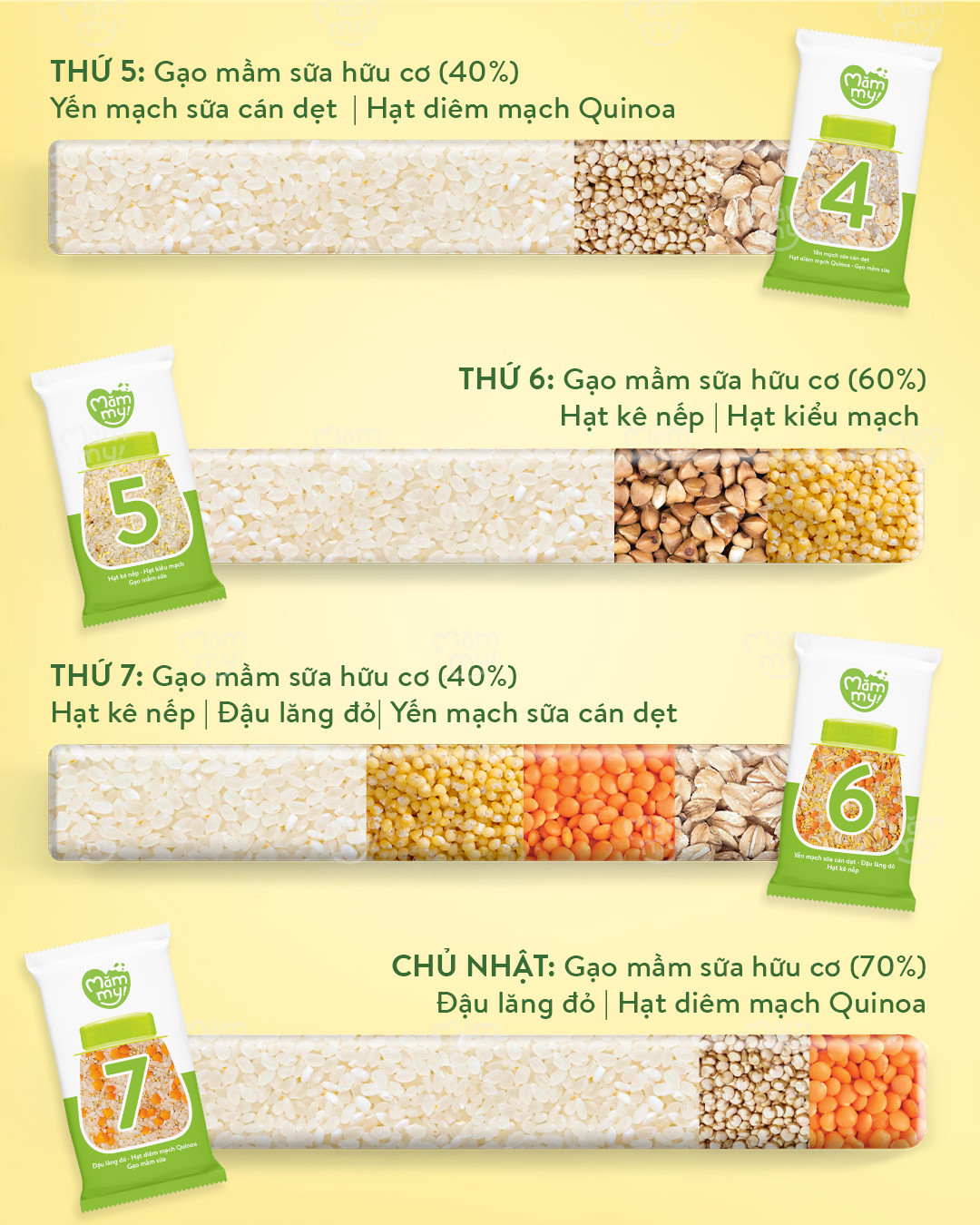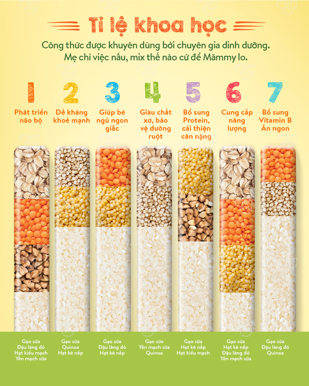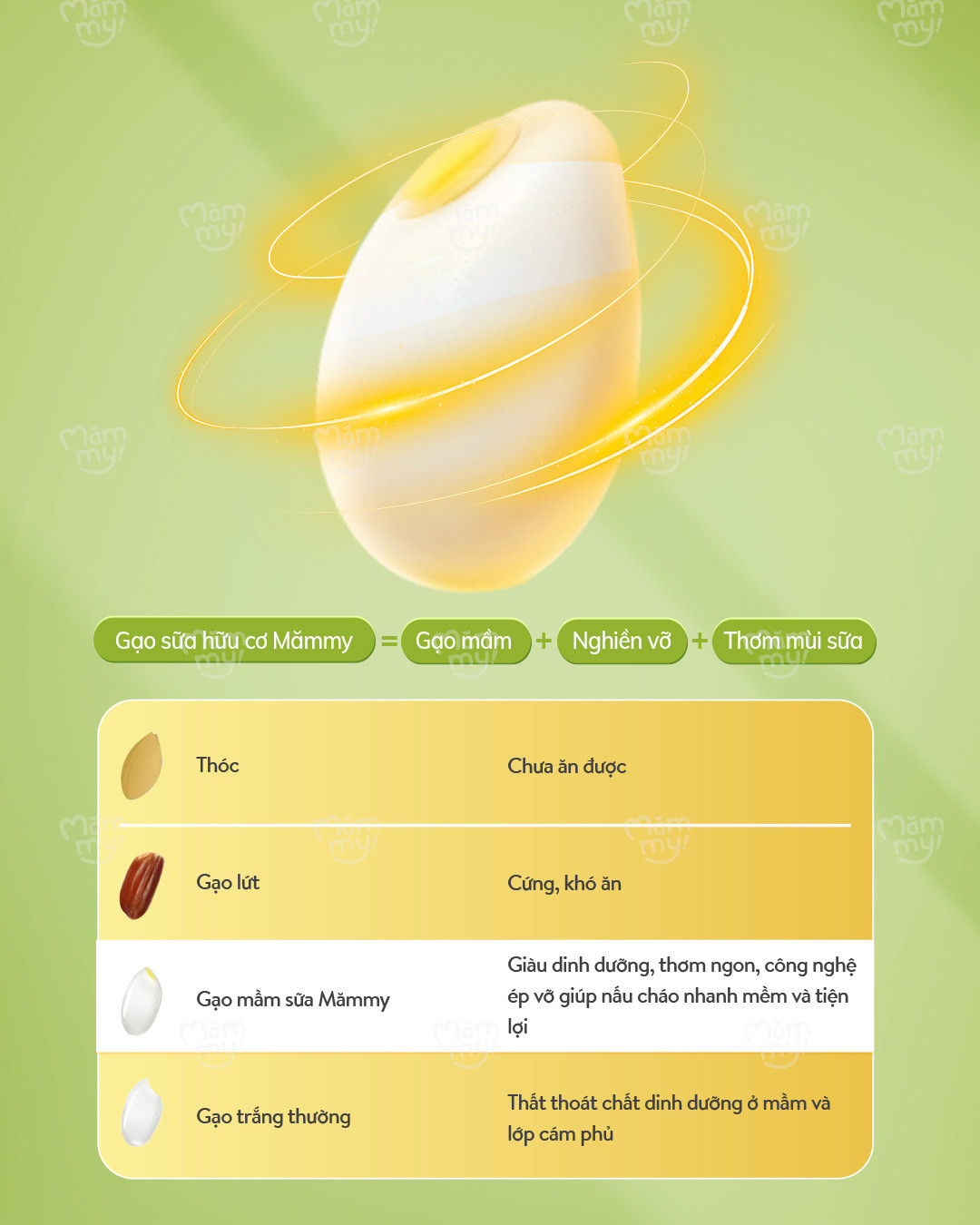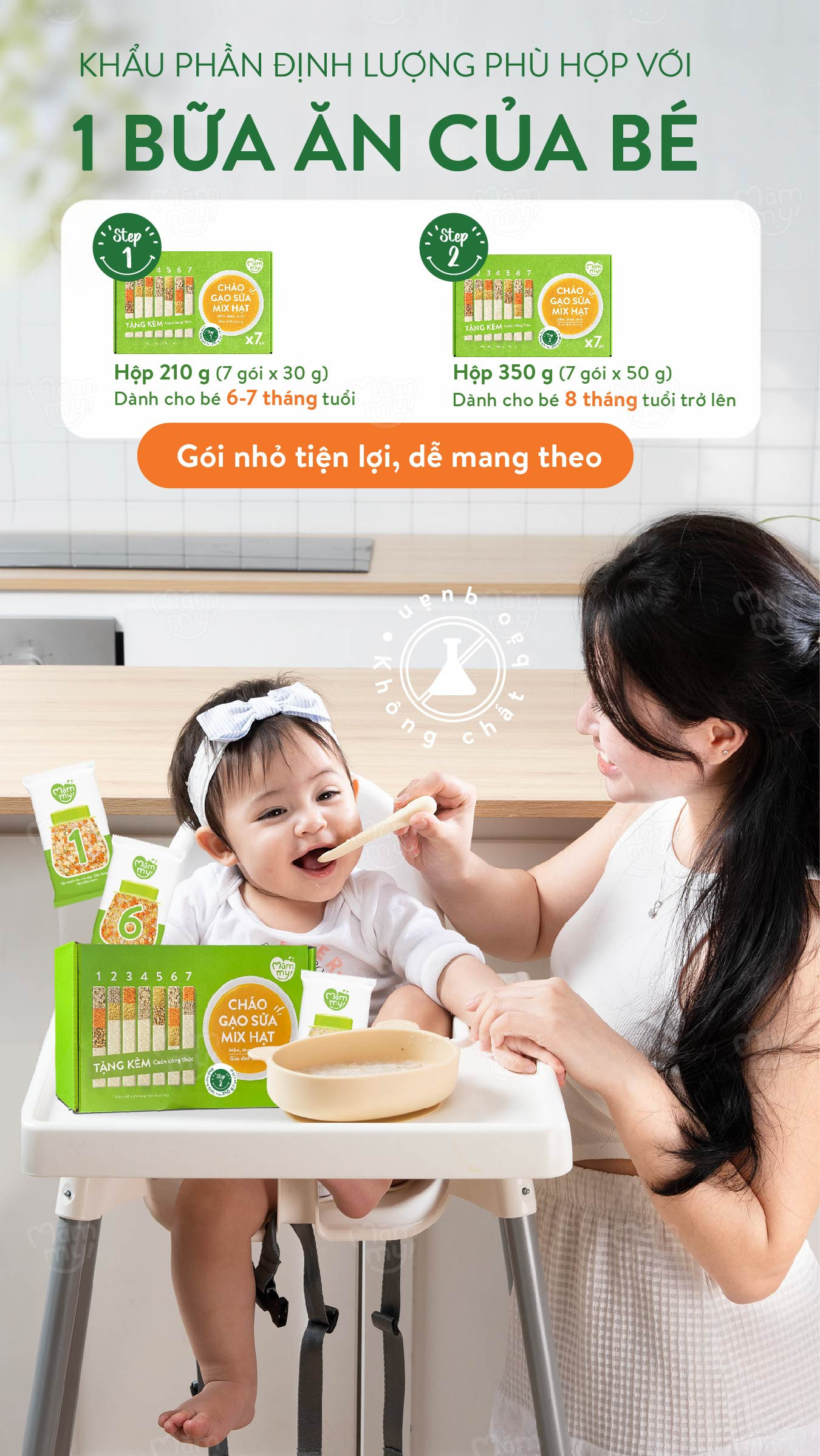 Cháo gạo sữa mix hạt hữu cơ Mămmy là dòng cháo ăn dặm hữu cơ cho bé từ 6 tháng tuổi, kết hợp gạo mầm sữa cùng các loại hạt giàu dinh dưỡng như quinoa (diêm mạch), yến mạch, đậu lăng đỏ, kê nếp và kiều mạch.