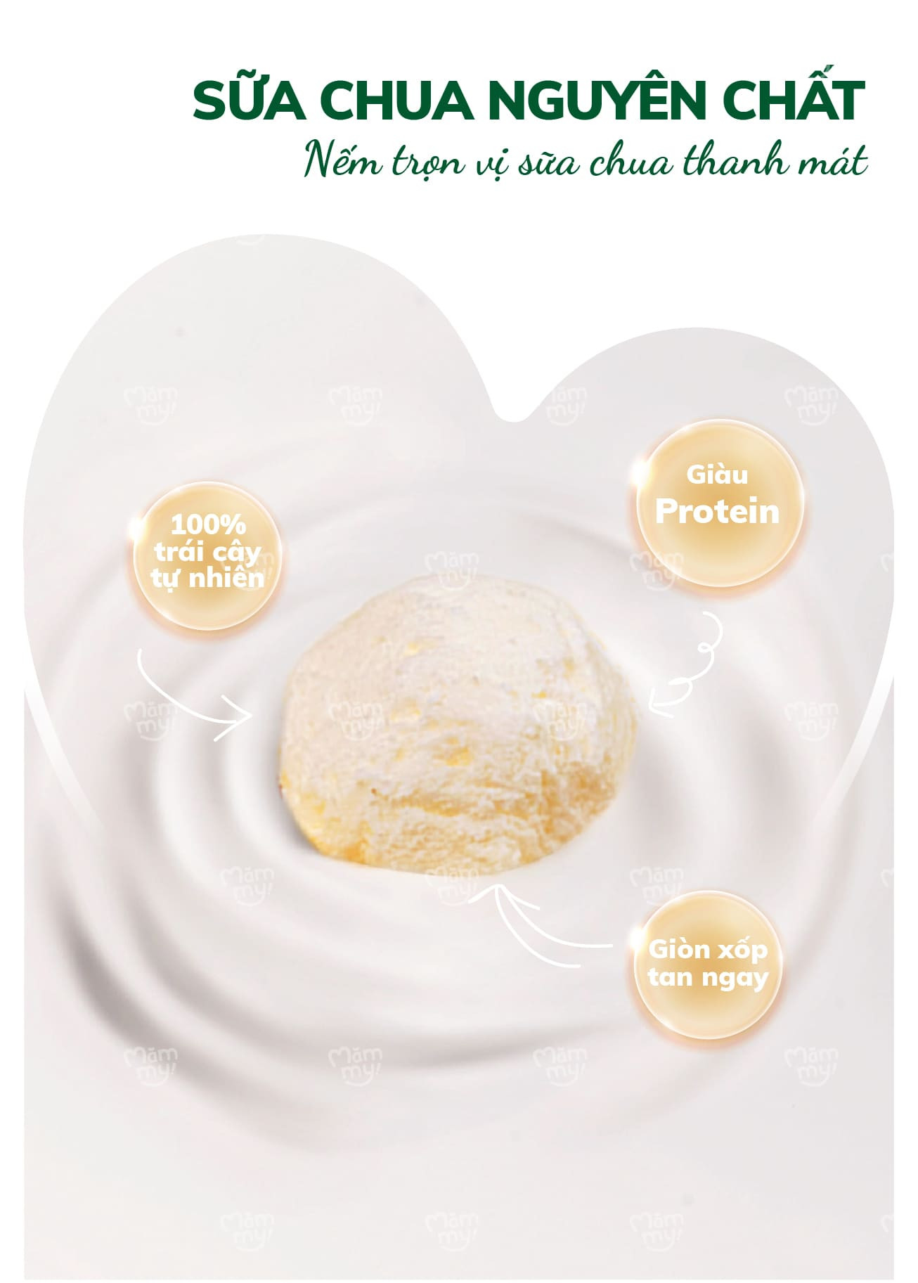 Hương vị thuần khiết: Giữ nguyên 99% thành phần từ sữa chua nguyên chất, mang lại vị chua nhẹ và béo ngậy đặc trưng của sữa.