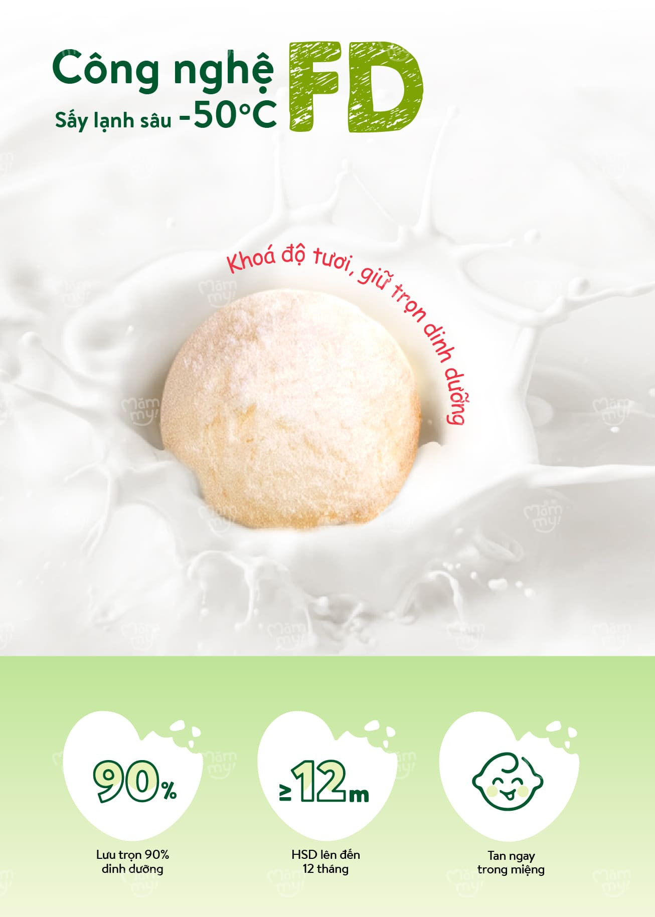 Công nghệ: Sấy lạnh sâu -50°C giúp giữ trọn vẹn cấu trúc lợi khuẩn và độ béo ngậy tự nhiên của sữa.